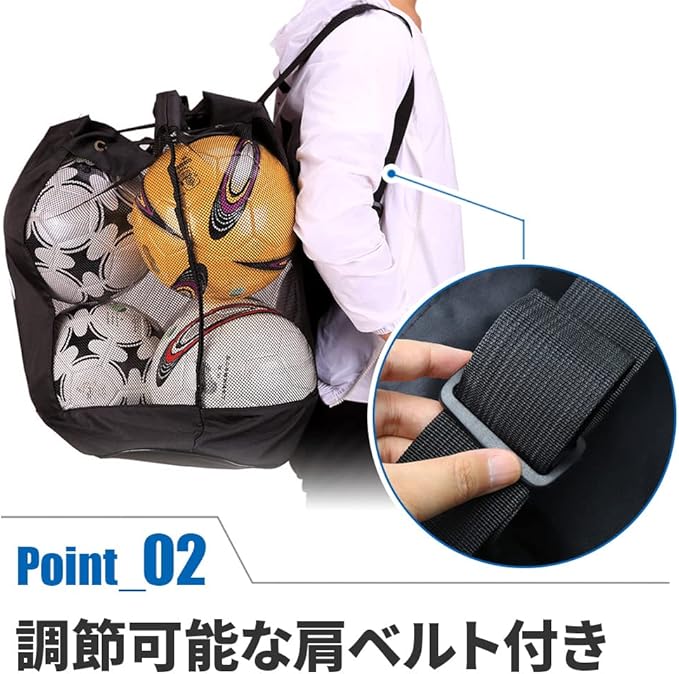 フリーサイズのショルダーベルト付きで練習や遠征などへの持ち運びにピッタリ。口が大きく開く巾着式バッグのため、ボールの出し入れがしやすいところがポイントです。