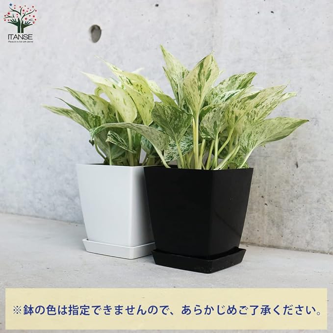 【ポトスについて】 丈夫で育てやすい観葉植物です。 空気清浄能力に優れており、NASAの研究によって明らかになった『空気清浄能力に優れた植物』の50種のうちに、ポトスが入っているほどです。 耐陰性が強く、ハンギングやヘゴ仕立てなどにして、よく室内でも育てられています。 丈夫なので、寄せ植えにも最適です。 品種によって様々な葉形や模様があり、好みによって選ぶことできる、優秀なインテリアグリーンです。 【品種特徴】 マーブルクイーンは、他のポトスにはない白く大きな斑が特徴の、葉を楽しむ観葉植物です。 葉の緑と斑の比率が逆転しており、ほとんどが白い斑で、絵具を飛ばしたように、本来の葉の緑が点在しています。 その葉姿が美しく、人気の高い品種です。 しかし一方で、マーブルクイーンは育成の難しさでも知られています。 葉の緑が少ないせいか、生長が遅く、日光で葉焼けがしやく、また寒さにも弱いのです。 そのため、最初に育てる観葉植物には向きません。 しかし、それだけ育て甲斐があり、高い難易度に見合うだけの美しさを備えています。 植物をしっかり育てたい方に、ぜひオススメします。