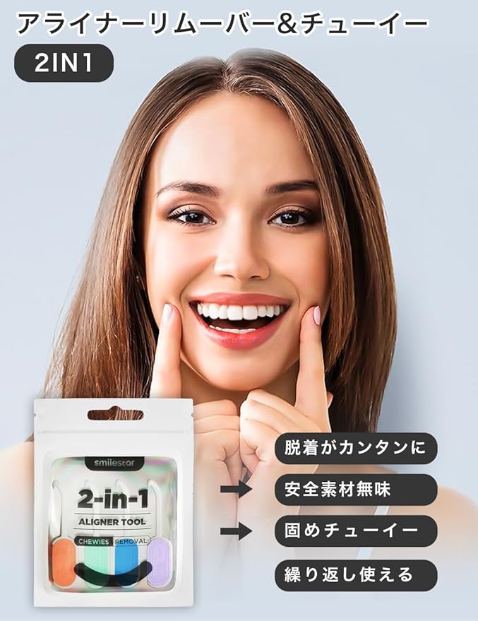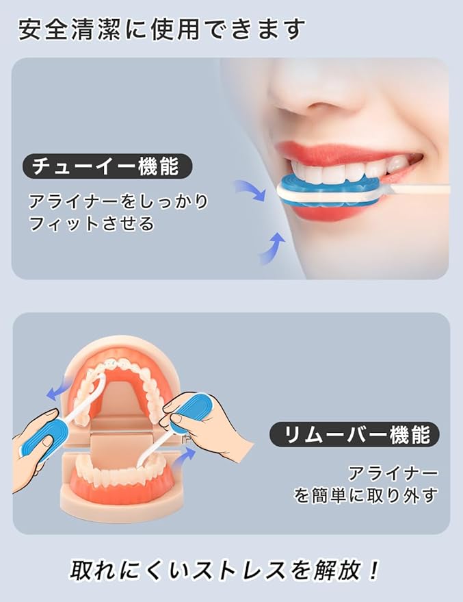 【付け外し2in1】アライナーリムーバーや矯正チューイー機能の両立。