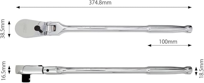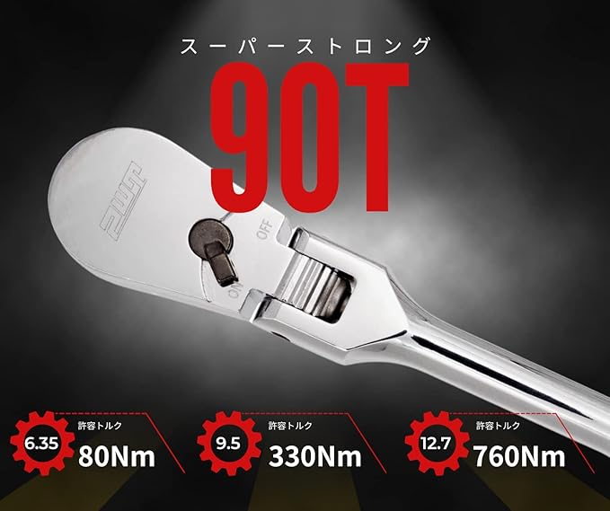 仕様:差込角:1/2インチ(12.7mm)、歯数:90、 許容トルク:760Nm、全長:374.8mm、重量:755g、材質:クロームバナジウム鋼、台湾製