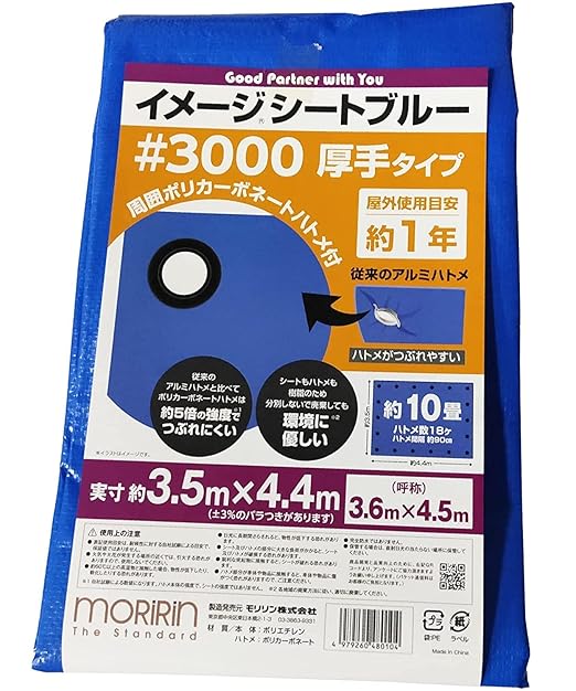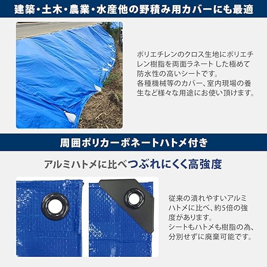 [仕様]#3000厚手、材質:ポリエチレン(本体)、ポリカーボネート(ハトメ)、ハトメ数8ヵ所、ハトメ間隔約90㎝。