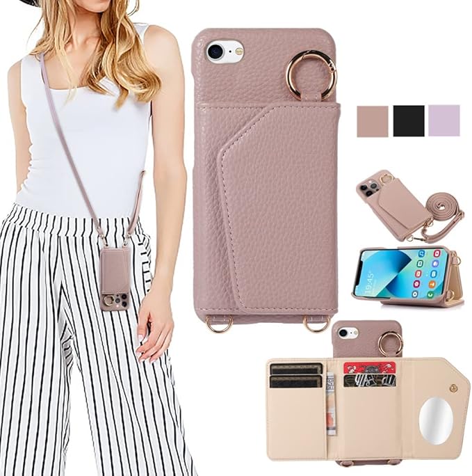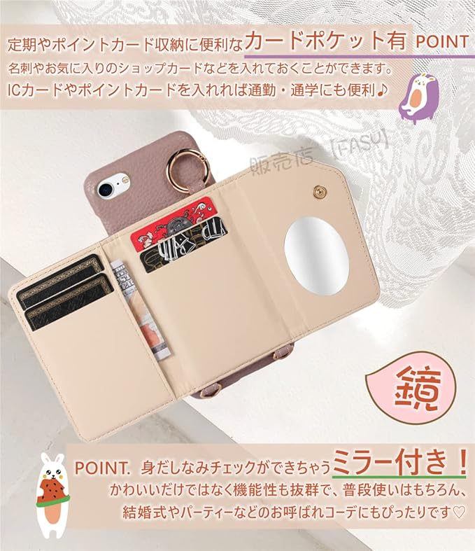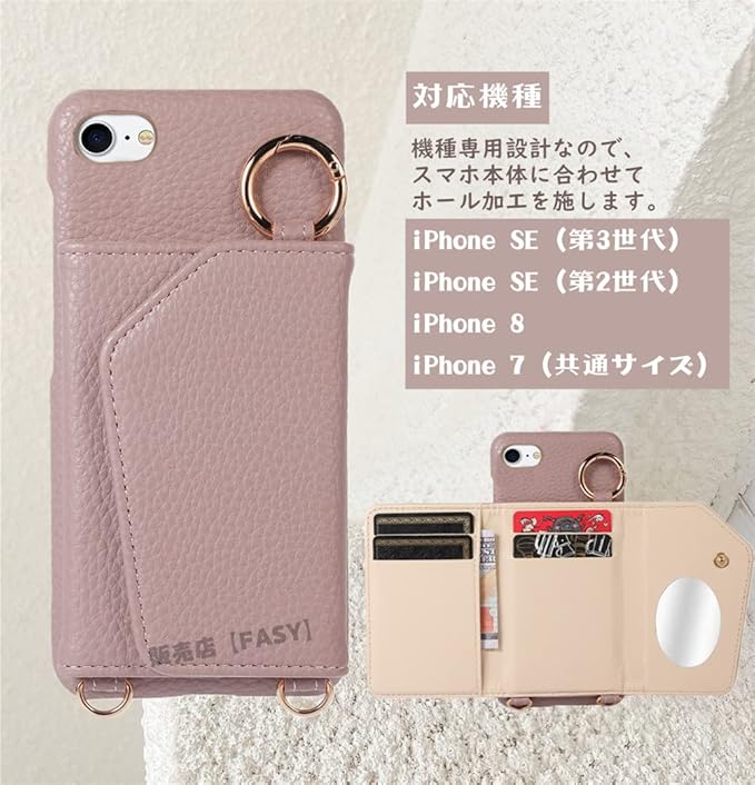iPhonese 第3世代 ケース ショルダー ストラップ FASY アイフォンse カバー 第二世代 第三世代 iPhone se3 2022 se2 2020 スマホケース ショルダー タイプ ミラー 鏡付き アイホンSE 肩掛け 背面手帳型 財布型 かわいい おしゃれ アイフォン8 ケース 耐衝撃 iPhone8 7 携帯 ケース カバー 斜め掛け リング付き 首掛け ピンクベージュ | oioioichan