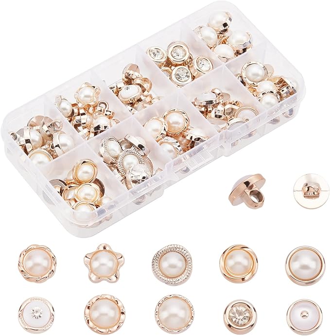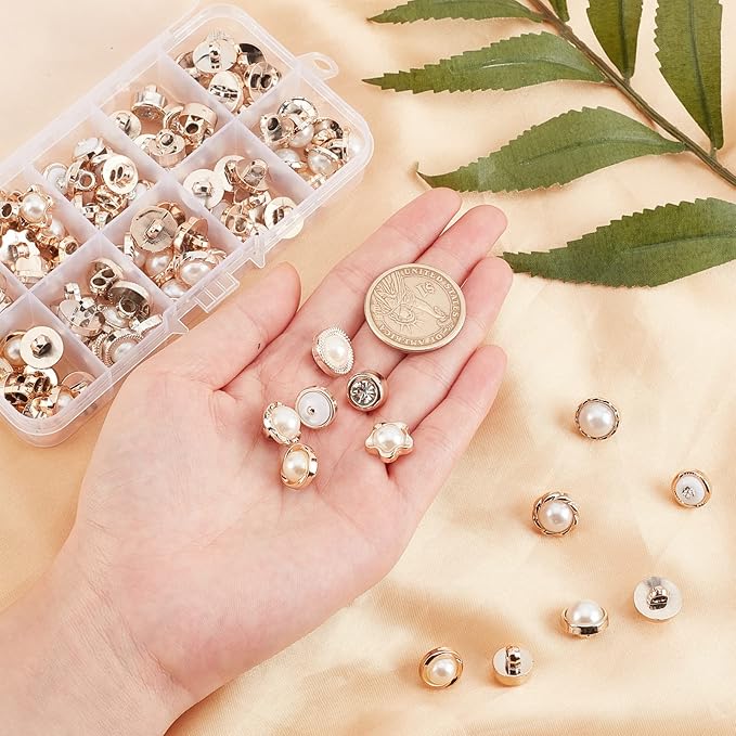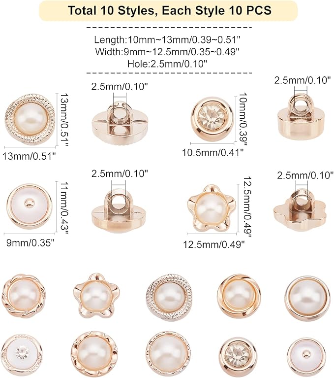 10スタイル:各スタイル10個ずつ、合計100個のパールボタンがセットになっています。 大きさは約10~13mmで、どんな服にも縫い付けたり、接着したりと汎用性があり、使い勝手が良い。