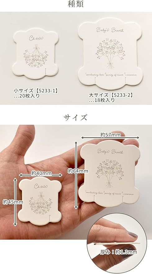サイズと入数・小サイズ…約 40mm 45mm (20枚入) ・大サイズ…約 57mm 64mm (18枚入)