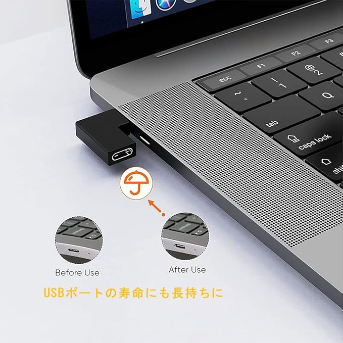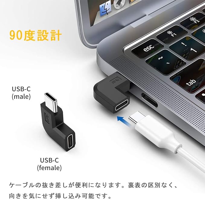 【USB Cアダプター L字】パッケージ:2*USB Cアダプター(L型)。USB-C オスからメスに変換するL字アダプタです。90度設計で、ケーブルの抜き差しが便利になります。裏表の区別なく、向きを気にせず挿し込み可能です。USBポートの寿命にも長持ちにさせます。