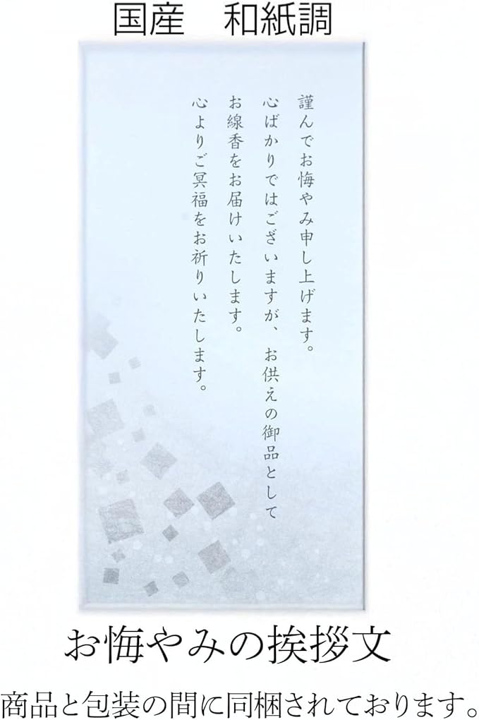 お悔やみの弔文付き。包装の内側に同封しております。ご安心ください。