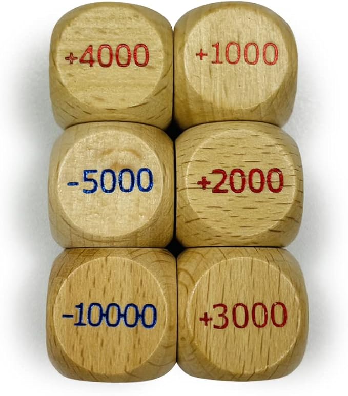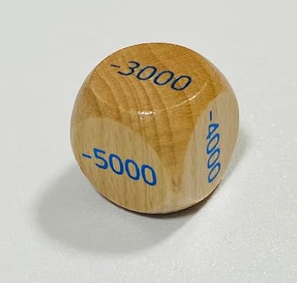 内容物 ・6面木製ダイス6個 (赤色 4つ +1000 +2000 +3000 +4000 +5000 +10000 ) (青色 2つ -1000 -2000 -3000 -4000 -5000 -10000 )