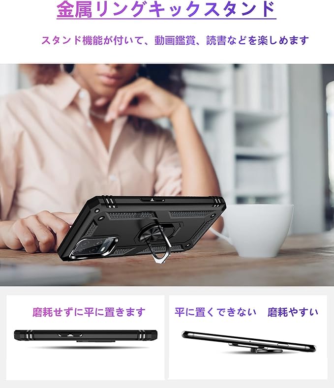 【リング付き・スタンド機能】後ろで嵌め込み式リング付き、伝統的なリングと比較して、スマートフォンの水平安定性を維持することができます。ケースを横向きにするとスタンド機能になり、360度回転と120度調節可能です。マグネット対応金属板採用し、車載ホルダーに強く吸着することもできます。