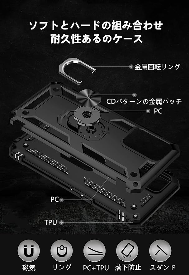 【耐久性】PCバック+TPUバンパー+金属ホールリング、内側TPU素材とハードPCフレームで制作するため、耐久性に優れた、外 部からの衝撃を内部に吸収されて、側に滑り止めの設計で、落下を防止にできます、防指紋。