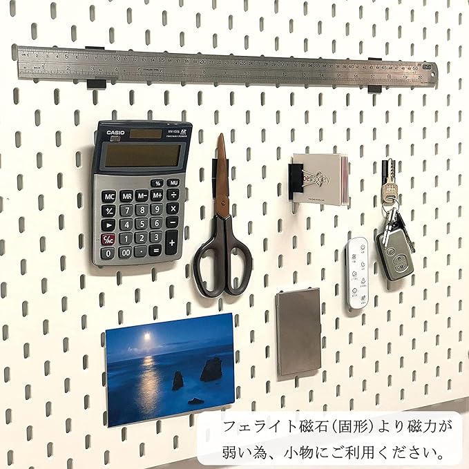 【ご注意に】①冷蔵庫やホワイトボード、金属などの滑らかな表面にご使用してください。②フェライト.(固形)より磁力が弱い為、小物にご利用ください。③磁力の強さは主に使用対象物の鉄分と接触面積に依存するため、シーンによって能力が異なる場合があります。