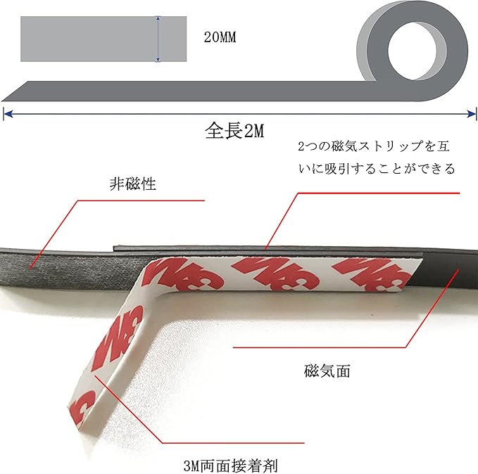 【商品仕様】サイズ:厚さ2mm 幅20mm 長さ2m 材質:剥離紙、粘着剤、強力マグネット 適用場所:浴室や車庫、家、学校、金物屋、修理屋、オフィス、キッチンなど