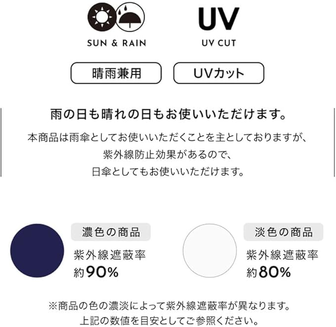 【晴雨兼用】雨の日も晴れの日もお使いいただけます。本商品は雨傘としてお使いいただくことを主としておりますが、紫外線防止効果があるため日傘としてもお使いいただけます。