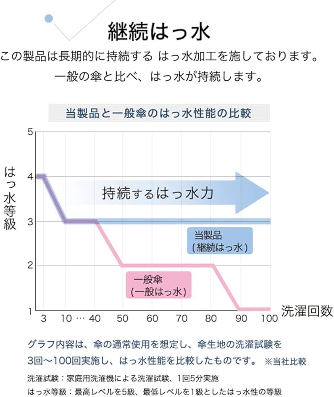 【継続はっ水】一般的なはっ水加工に比べ、長期的にはっ水効果が持続する加工を採用。長く大切に使って頂けるサステナブルな一本になっています。