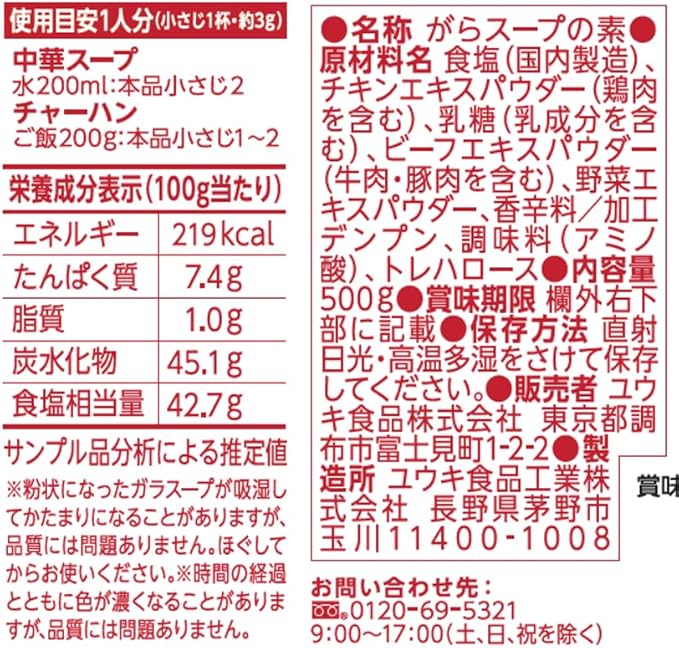 原材料:食塩(国内製造)、チキンエキスパウダー(乳成分・鶏肉を含む)、乳糖(乳成分を含む)、ビーフエキスパウダー(牛肉・豚肉を含む)、野菜エキスパウダー、香辛料/加工デンプン、調味料(アミノ酸)、トレハロース