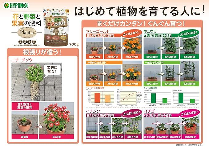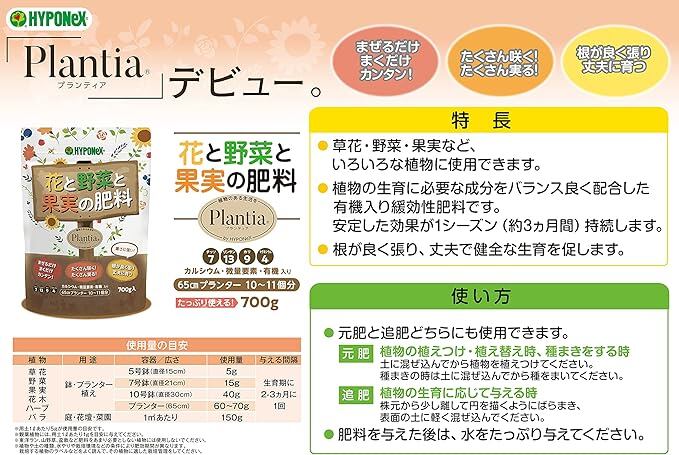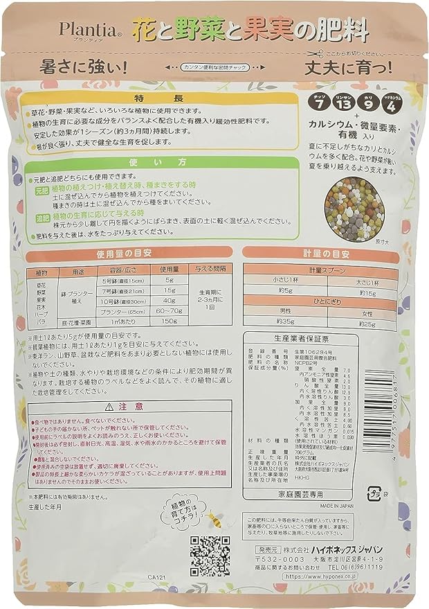 花や野菜、果樹や観葉植物など、いろいろな植物に使えるです。植物の生育に必要な成分をバランス良く配合し、さらに有機成分、カルシウム、微量要素を配合した緩効性です。すぐに着kはじめ、安定した効果が約3ヶ月持続します。