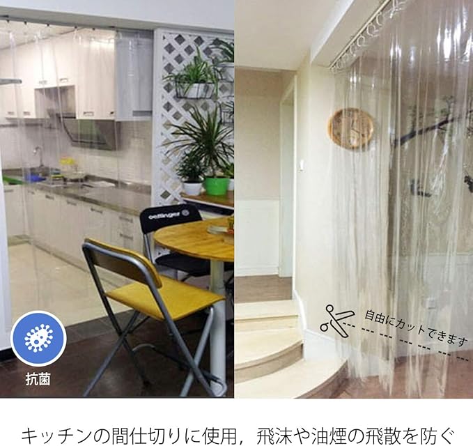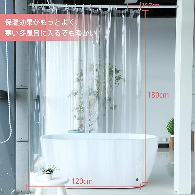 【使用場所が広い】バスルームでよく使用されるが、飛沫防止、ウイルス対策、間仕切りなども使用できます。幅・丈をスペースに合わせて自由にカットします。バスルームはもちろん、洗面スペースやキッチンお部屋の目隠しや間仕切りにも便利です。 【サイズ】:120x180cm 素材:PVC パッケージ内容:本体x1+プラスチック製カーテンリングx9個