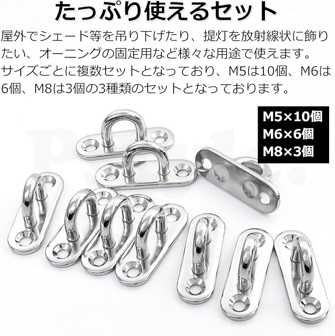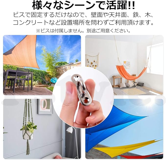 【たっぷり使えるセット】 屋外で日よけ、シェード等を吊り下げたり、提灯を放射状に飾りたい、オーニングの固定用、天井の吊り下げ金具としてなど、様々な用途でお使いいただけます。