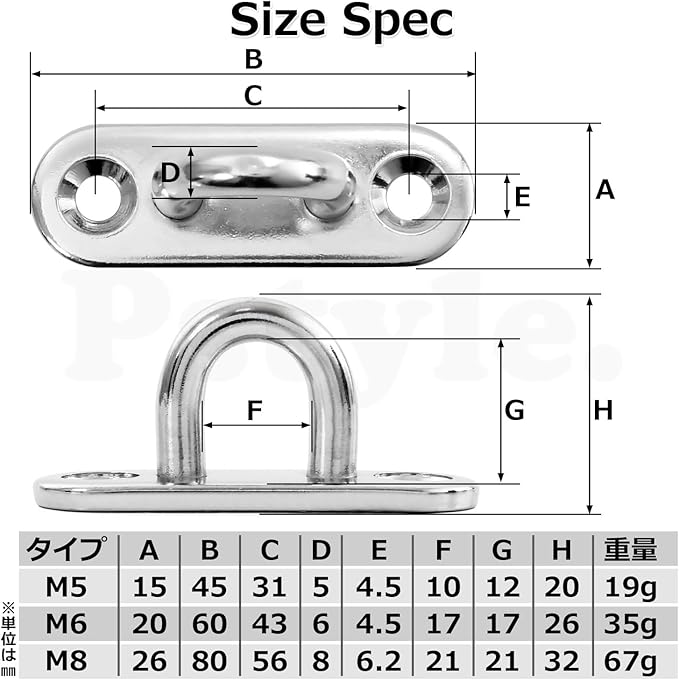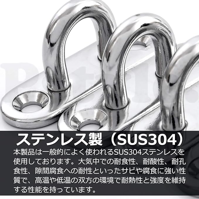 【SUS304ステンレス製】 アイプレートは一般的によく使われているSUS304ステンレスになっております。大気中の耐食性、耐酸性、耐孔食性、隙間腐食への耐性といったサビや腐食に強い性質があります。高温や低温など双方の環境で耐熱性と強度を維持する性能を持っています。
