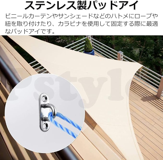 【ステンレス製パッドアイ】 ビニールカーテンやサンシェードなどのハトメにロープや紐を取り付けたり、カラビナを仕様して固定する際に最適なコの字の留め具です。