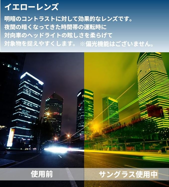 イエローレンズは、明暗のコントラストに対して効果的なレンズです。 夜間の暗くなってきた時間帯の運転時に対向車のヘッドライトの眩しさを柔らげて対象物を捉えやすくします。