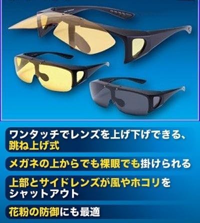 メガネの上からかけられる夜用サングラスです。 跳ね上げ式で、汎用性の高い アウトドアグッズ です。