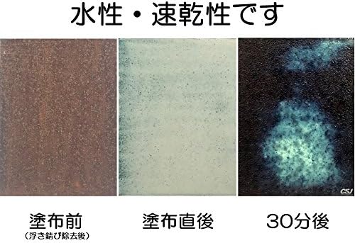 色:水性の原液は乳白色。塗布・転換後は徐々に黒色に。 市販塗料(水性・油性可)での上塗り可能。うすめ液、用具の洗浄:水。