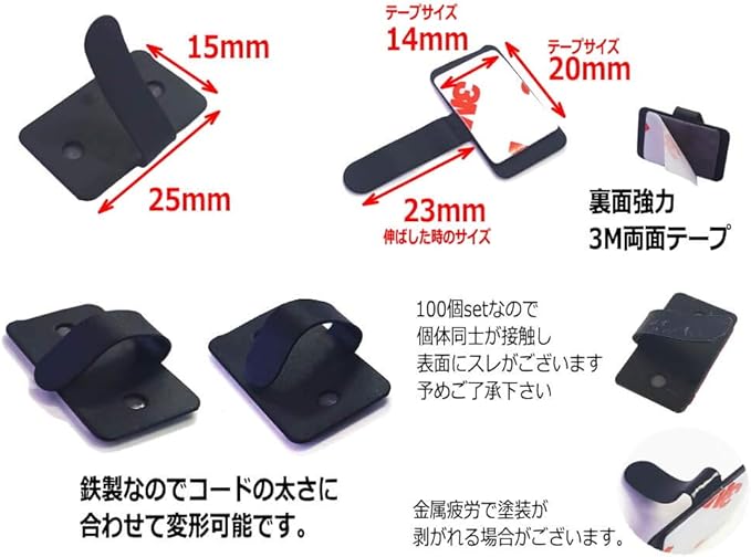 平らな面に接着して、電線、LANケーブルなどを爪で保持、固定します。鉄製ですので、配線の太さに合わせて止めることが可能です。
