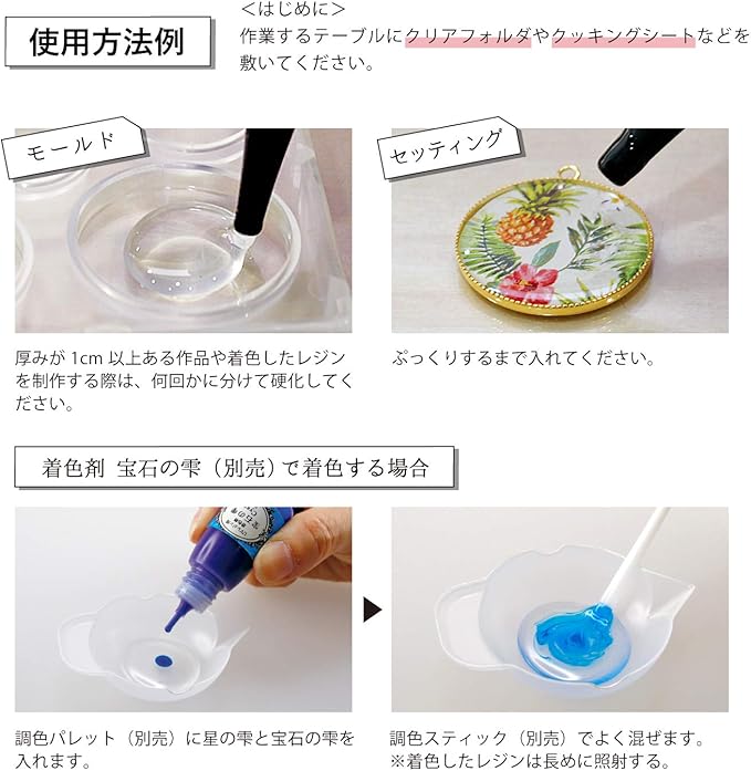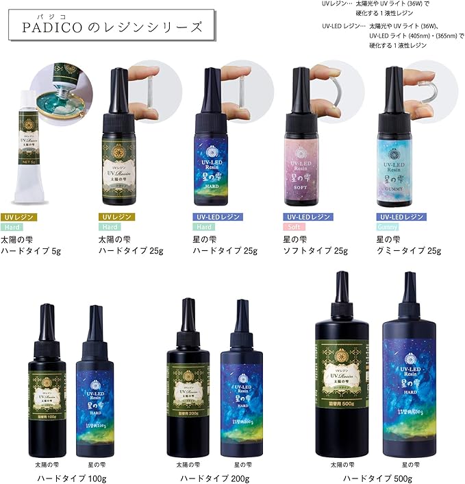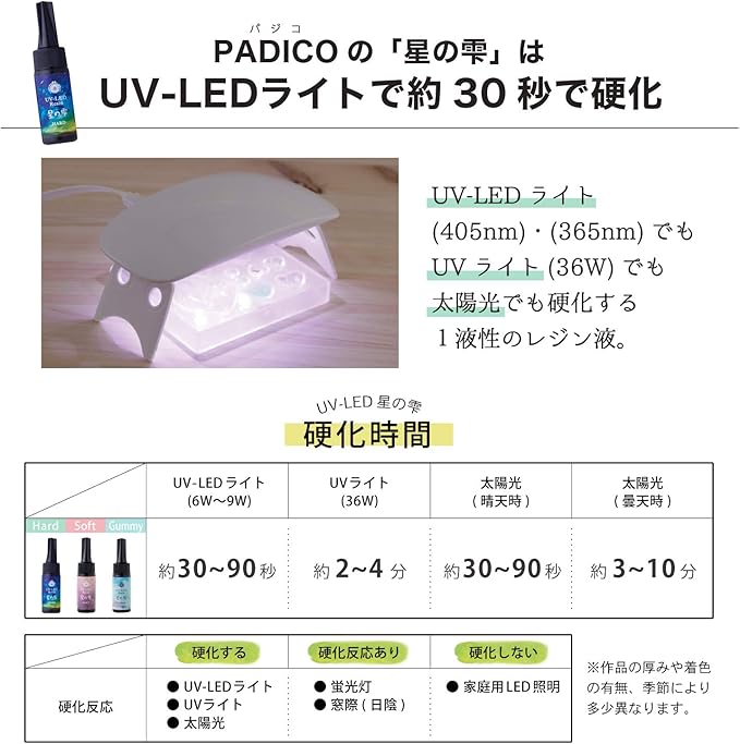 頑丈なハードタイプ、硬化が早い、美しい透明度、硬化後の黄ばみがない、UV/LEDライト対応。