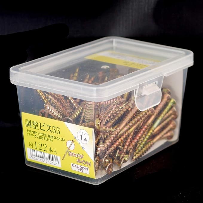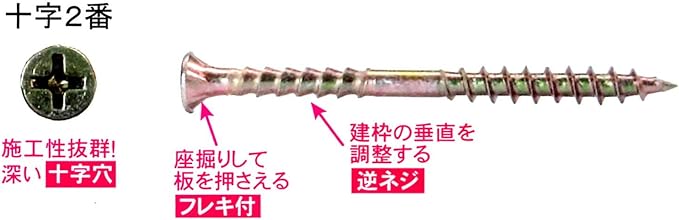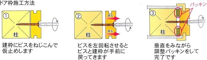 使用方法:建枠にビスをねじ込んで仮止めを行い、ビスを左回転させるとビスと建枠が手前に戻る事により、枠の曲りを調整し垂直にできる