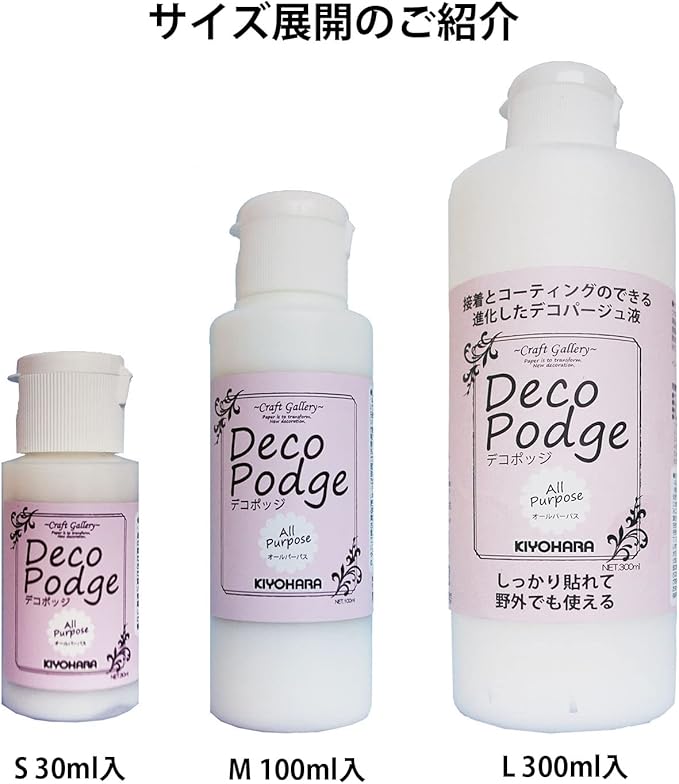 しっかり と貼りたいとき、よく使うものや 外 に出すものに貼りたいときにおすすめの デコポッジ ( デコパージュ ) 液 です。 接着力 、 耐水性 、 耐久性 に優れています。 紙 ・ 木 などはもちろん、 プラスチック や ガラス の デコ 、 屋外 で 使用 するものにもOK。