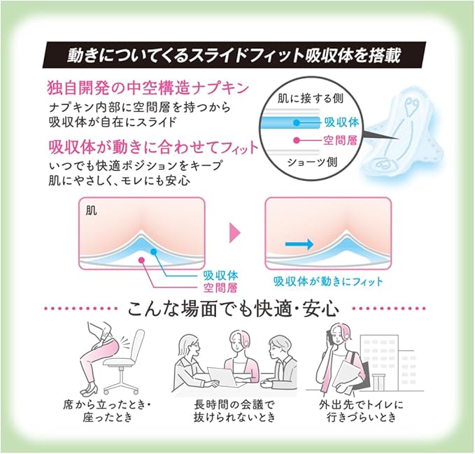 独自開発の中空構造ナプキン。ナプキン内部に空間層を持つから吸収体が自在にスライド。