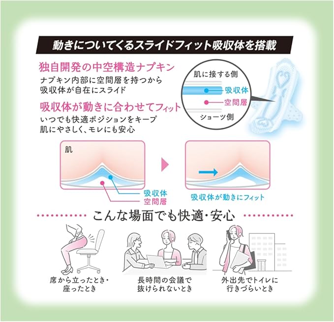 独自開発の中空構造ナプキン。ナプキン内部に空間層を持つから吸収体が自在にスライド。