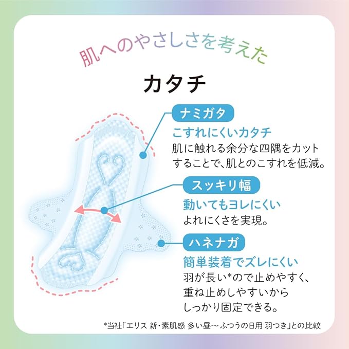 【ハネナガ】簡単装着でズレにくい:羽が長い※1ので止めやすく、重ね止めしやすいからしっかり固定できる。※1当社「エリス新・素肌感多い昼~ふつうの日用羽つき」との比較