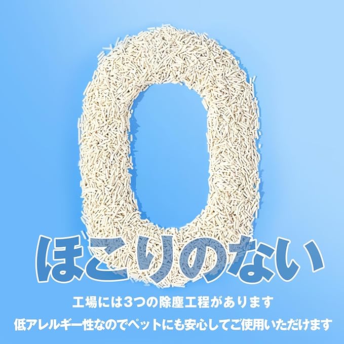 【粉塵が立たない】このおから猫トイレ砂は粉塵が立ちません。猫と掃除している人間が粉塵を吸い込まないため、健康に害を及ぼしません。掃除も楽です