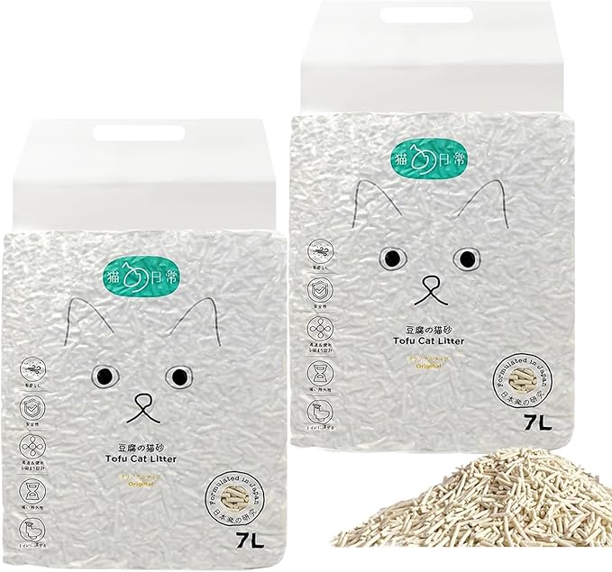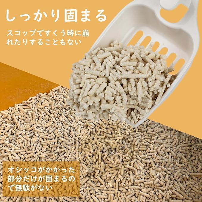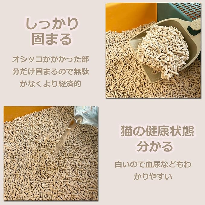 【しっかり固まる】おからの猫砂はエンドウ豆の繊維とコーンスターチから作られています。 細めの猫砂は吸収力がより高く崩れにくく、おしっこの部分だけがしっかりと固まりトイレの床面にもくっつきにくいので