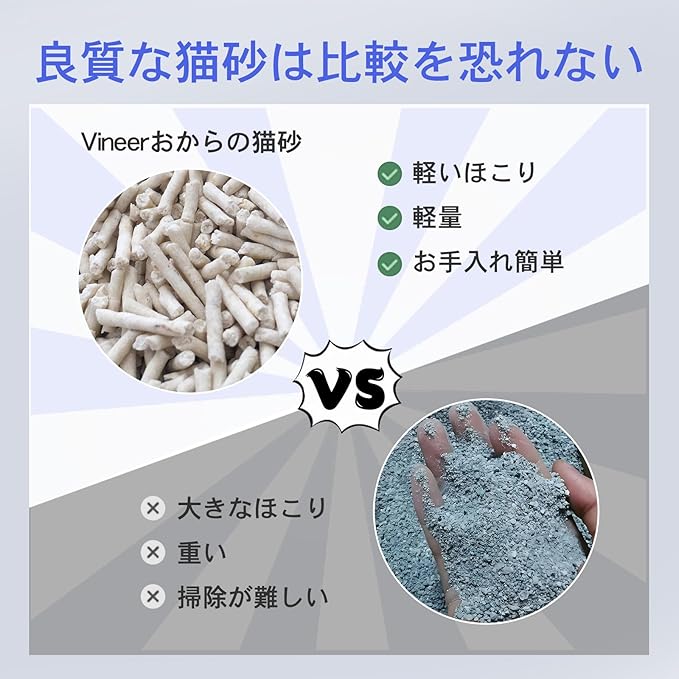 【粉塵が少ない】Vineer豆腐猫砂は粉塵が少ないです。粉塵が舞いにくく、猫が排泄後に砂かきをするたびに粉塵を吸い込む可能性が低いです。猫の健康を安心できます
