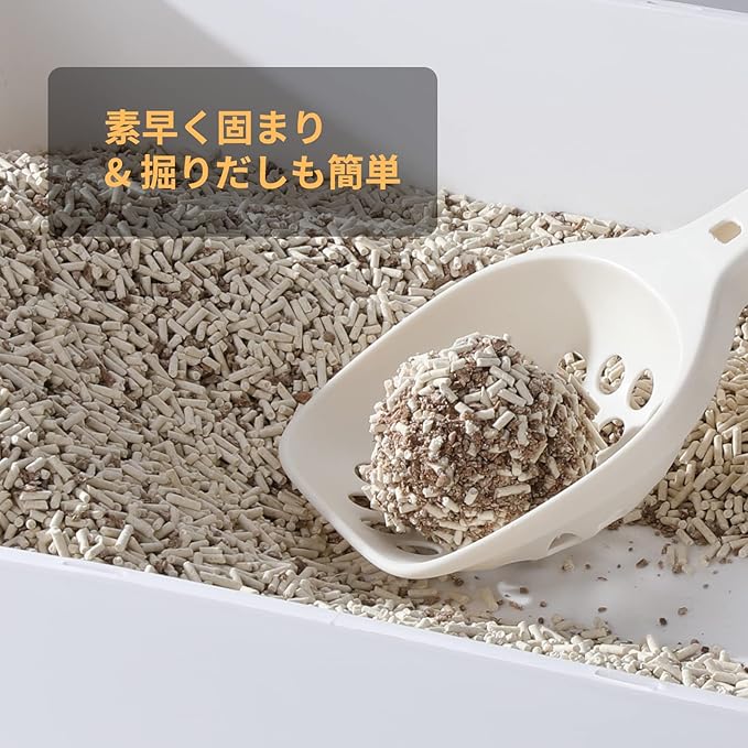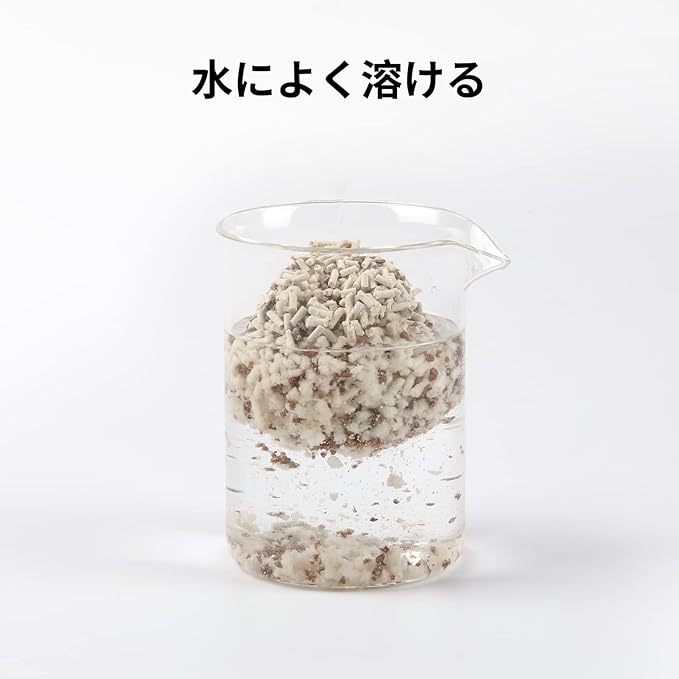 トイレに流せる ー この猫砂は水によく溶けるよう作られていますので、処理の時はお手軽にトイレにて流すことができます。