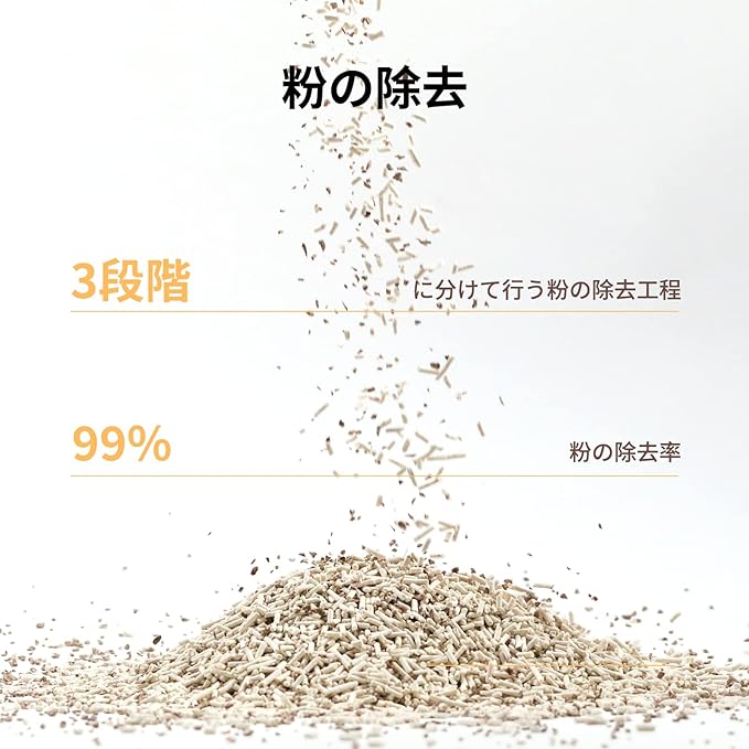 粉が少ない ー 猫砂を購入する多くの方は、できるだけ粉が舞わないようような猫砂を探しています。この猫砂はその点も問題ありません。3回にわたって粉を処理する工程を行い、99.99%粉をカットしています。