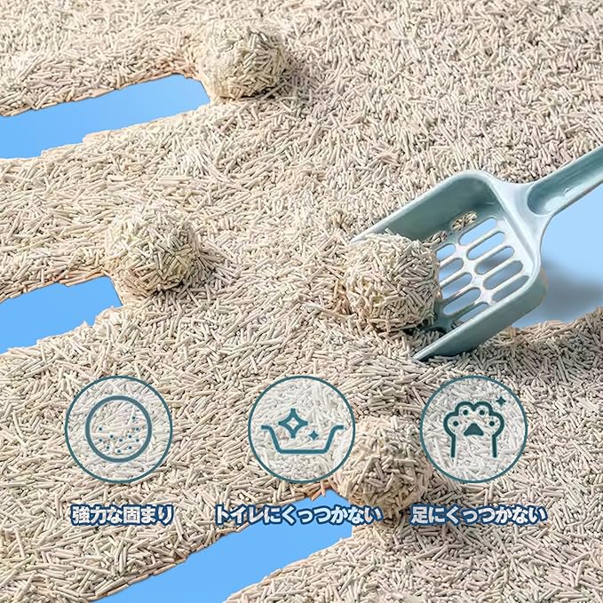 【しっかりと固まる】Gatitosおからの猫砂は、オシッコがかかった部分だけがしっかりと固まります。細長い形状なので、固まった砂以外はスコップのすき間から簡単に落ち、無駄がなく経済的で、捨てる際も便利です。
