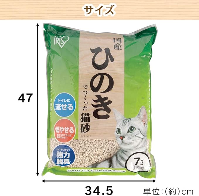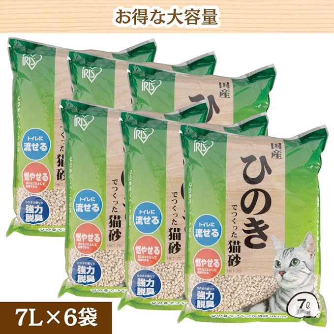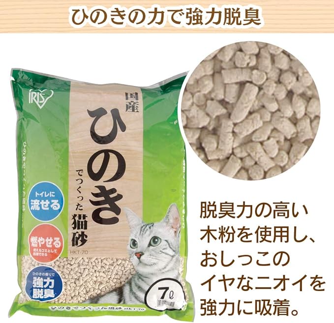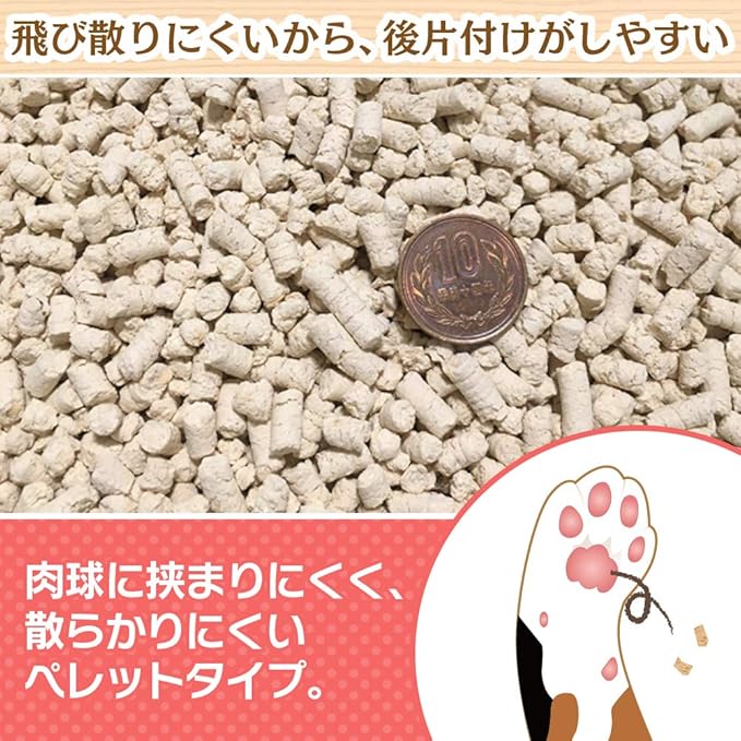 燃えるゴミとしても処理できるので後始末が簡単です。 砂の粒が猫の足の指に挟まりにくく、飛び散りにくいペレットタイプです。 脱臭力の高い木粉を使用しているので、おしっこのイヤなニオイを強力に吸着します。