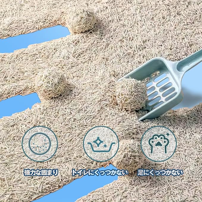 【しっかりと固まる】Gatitosおからの猫砂は、オシッコがかかった部分だけがしっかりと固まります。細長い形状なので、固まった砂以外はスコップのすき間から簡単に落ち、無駄がなく経済的で、捨てる際も便利です