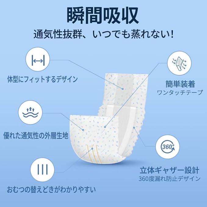 【製品仕様】男の子用おしっこ紙おむつ 数量:50枚入り 素材:表面材:ポリオレフィン、ポリエステル不織布 吸水材:綿状パルプ、吸水紙、高分子吸水材 防水材:ポリエチレンフィルム 止着材:ポリオレフィン 伸縮材:ポリウレタン