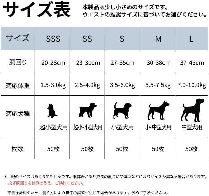 【適応サイズ】SSS、SS、S、M、Lの5サイズからお選びいただけます。 SSS:胴回り:15-30cm、適応体重:1.5-3.0kg(超小型犬用) SS:胴回り:30-35cm、適応体重:2.5-4.0kg(超小型~小型犬用) S:胴回り:35-40cm、適応体重:3.5-6.0kg(小型犬用) M:胴回り:40-45cm、適応体重:5.5-7.5kg(小型~中型犬用) L:胴回り:45-50cm、適応体重:7.0-10.0kg(中型犬用) ご購入前に必ずサイズ表をご参照の上、愛犬に合ったサイズをお選びください。