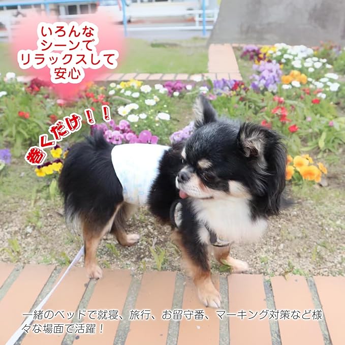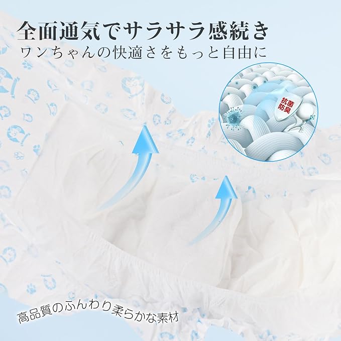 【ふわさら肌触り&全面通気シート】肌にあたる部分なので、やさしい肌触りの通気性の良い素材を使用、長時間付けていても蒸れにくい!【抗菌防臭加工】犬用おむつは抗菌防臭加工でいつも清潔!