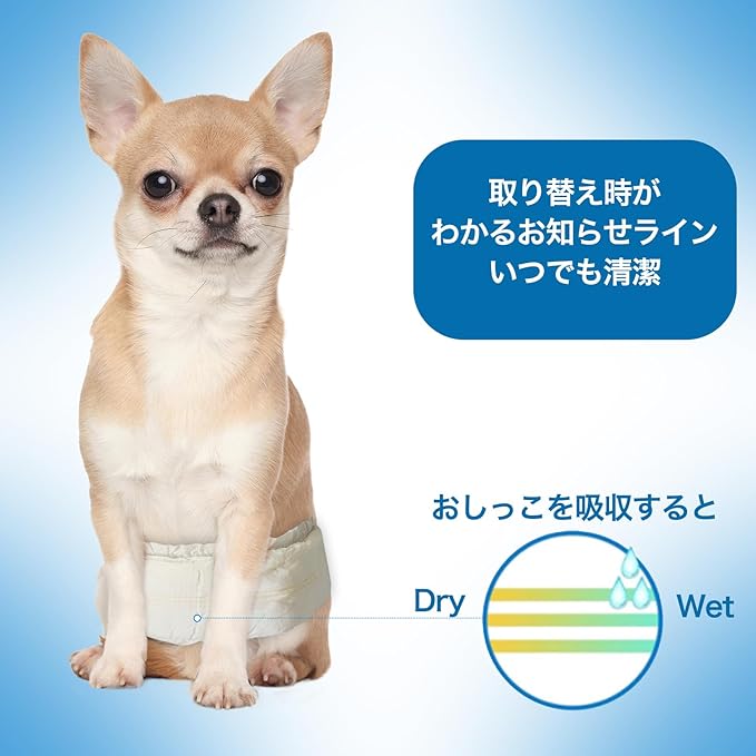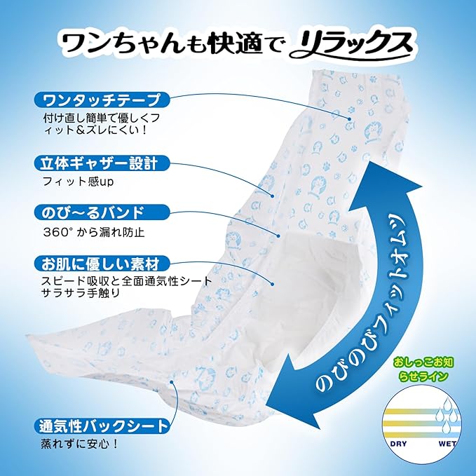 【便利なおしっこお知らせライン付き!】おしっこしたら犬おむつの黄色のラインが青色に変わってお知らせしてくれてとっても便利! 【つけ直しらくらくテープ】面ファスナーが幅広く愛犬のサイズにピッタリ合わせることができます。のびのび立体モレ防止ギャザーで、お腹から腰部分に巻くだけで手軽に装着できるため、お出かけ時のマーキング対策にうってつけ。
