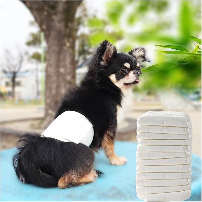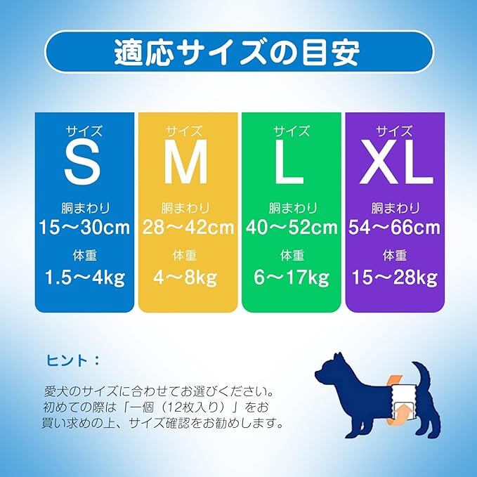 【製品仕様】犬おむつ 男の子用 一個(12枚入り) カラー:ホワイト(無地) Sサイズ: 胴周り: 15~30㎝、適応体重:1.5~4kg 素材:表面材/ポリエチレン、ポリエステル不織布 吸水材/綿状パルプ、吸水紙、高分子吸収材 防水材/ポリエチレンフィルム 伸縮材/ポリウレタン 面テープ/ポリプロピレン、不織布 マジックテープ式なので、固定用のマジックテープは大きくて、愛犬に適切なサイズに調整できます。伸縮性の縁で、わんちゃんの動きにもピッタリフィットします。