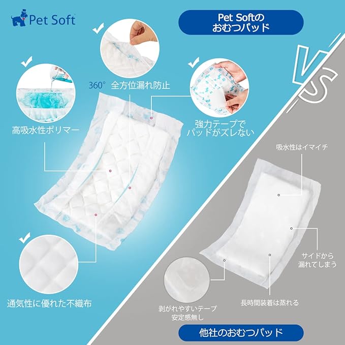 【優れた吸水性能】pet softおむつパッドは中身は吸水性能に優れた素材を採用し、水分が素早く吸収されます。水分はパッドの中にしっかりロックされ、逆戻りせず、お肌がサラサラでワンちゃんが快適です。