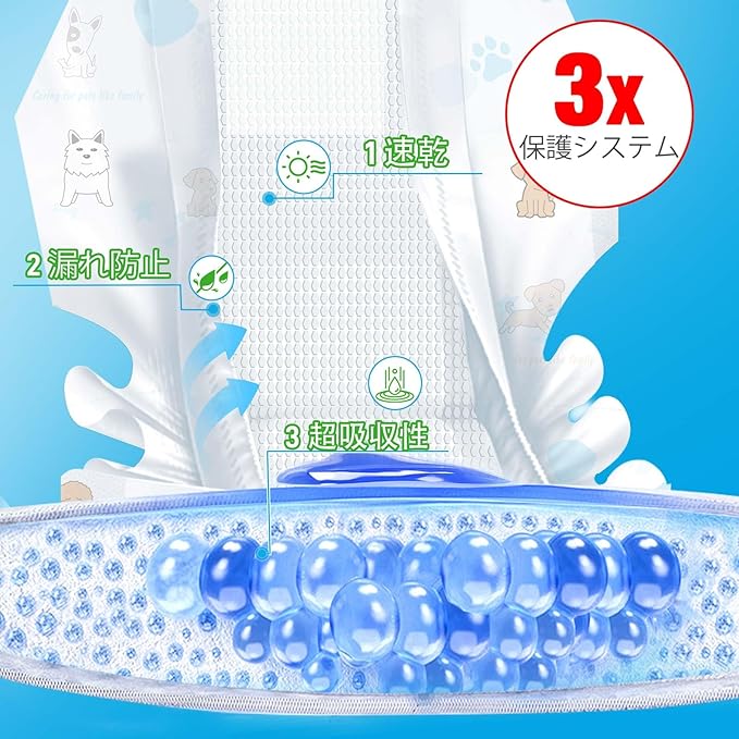 2 倍の速さで吸収: 犬用おむつは吸湿発散性ライナーで作られており、水に触れる表面積が広く、数秒で湿気を吸収して犬をドライで快適に保ちます