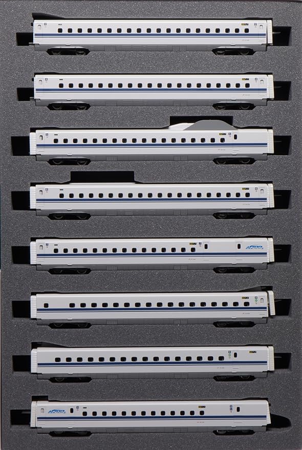 エアロ・ダブルウイング形の先頭部を的確に再現。特徴的な車体間の全周ホロを再現。屋根上の号車番号表記や赤い車端部警戒色を再現。ホワイトの車体にブルーのラインを配した爽やかな車体塗色を美しく表現。