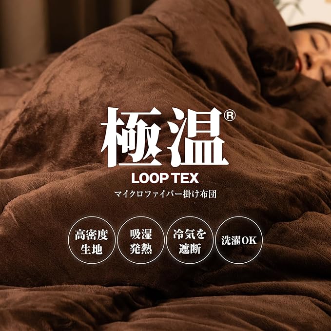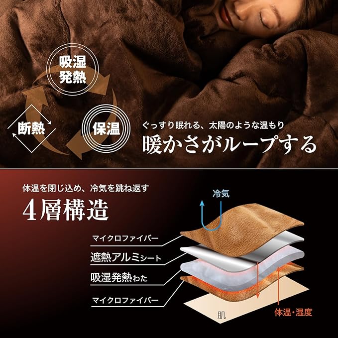 【発熱⇒保温⇒遮熱がループ!暖かさ持続!】極温ループテックスは吸湿発熱わた・アルミ蒸着生地・高密度フランネルにより、ぽかぽかを繰り返す特殊構造の毛布。優れた保温性能とふわふわ手触りで、冬の寒さに負けずに安眠へと導きます。
